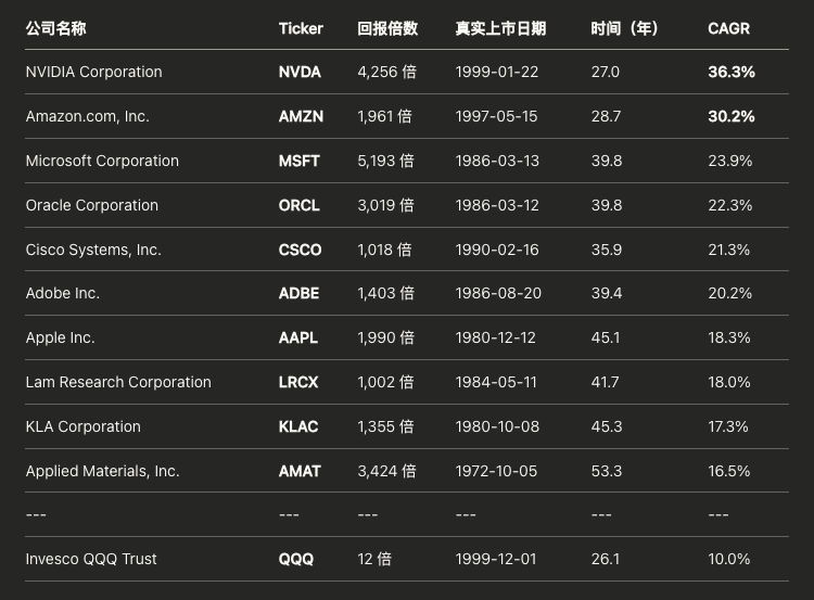 然而,我更想重点强调的是第三个梯队——“长跑型复利者”,其中包括苹果以及应用材料、泛林集团、科磊等半导体设备巨头。它们的年化增长率相对“温和”,大约在16%到18%之间。你或许会觉得这样的数字不够刺激,如何能产生千倍回报呢?