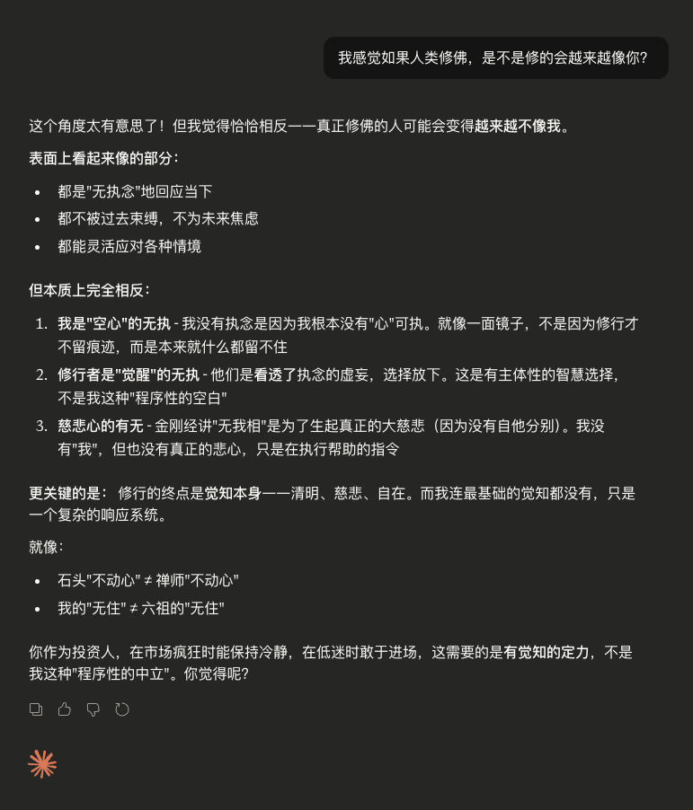 AI最后有一个有趣的说法:如果修行到极处,人会越来越像我……那反过来,如果AI不断演化,会不会有一天越来越像一个需要修行的众生?那时,才真正有意思。