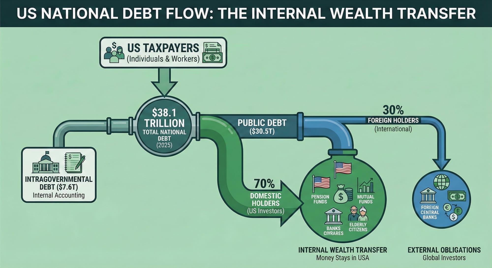 当我们谈论美国38万亿美元的国债时,很多人会本能地认为这是美国“欠外国的钱”。但事实远比这复杂得多。2025年的数据揭示了一个令人震惊的真相:美国国债最大的受益者,其实是美国人自己。(但是财富进行了转移)