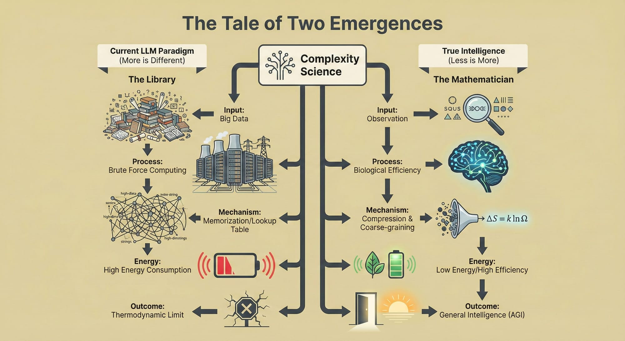 本报告旨在对该论文进行详尽的拆解与验证。分析表明,论文的核心论点在于区分“能力的涌现”(Emergent Capabilities)与“智能的涌现”(Emergent Intelligence)。作者指出,当前AI产业界普遍观察到的所谓“涌现”现象——即随着参数量增加,模型突然具备某种能力的现象——往往是度量标准选择不当造成的统计假象,或者是高维数据记忆的某种表现,而非系统内部发生了真正的相变或重组。真正的智能,应当符合“少即是多”(Less is More)的原则,即通过极度压缩的高层变量来解释复杂现象,从而实现计算与能耗的极致效率;而当前的LLM正沿着“多即是多”(More is More)的路径狂奔,试图通过穷举所有可能性的高维查找表来模拟智能,这在物理本质上是反智能的。